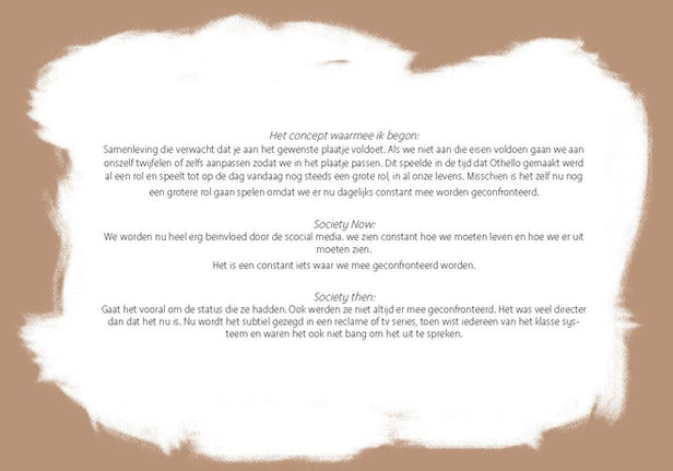 Echter wil ik dit effect groter maken en laten zien dat dit probleem bij zowel mannen als bij vrouwen speelt. Vandaar de keuze om Bianca ook een donkere huidskleur te geven. In het verhaal wordt ze als minderwaardig gezien omdat iedereen haar als een hoer ziet, in mijn versie is het omdat ze een donkere huidskleur heeft. Othello wordt ook in het verhaal als minderwaardig gezien door zijn huidskleur ondanks dat hij de commandant is.