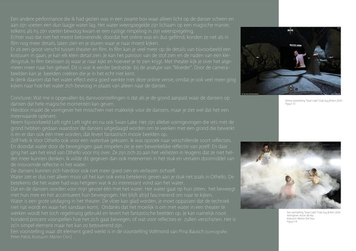 For my thesis I researched two of my great passions, theaterdesign and dance. In my thesis you can read about my own experiences with those two worlds and about analyzes of dance performances that have stayed with me.
